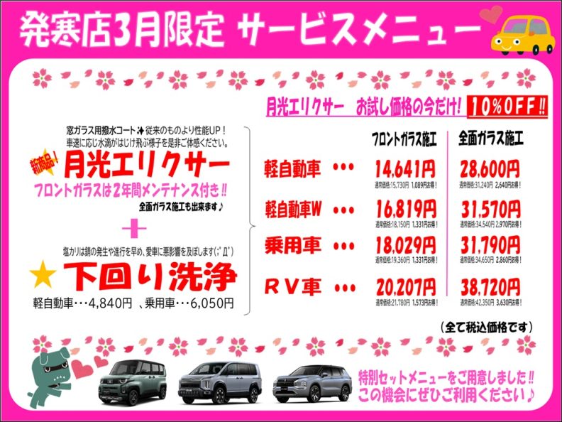 サービスメニューのガラス撥水と下回り洗浄も大変ご好評いただいておりますので、