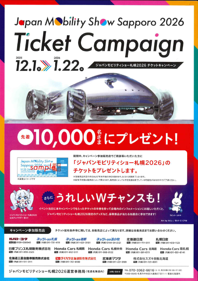 このキャンペーンは、北海道内の多くの販売店が協力して、合計10,000名様へチケットをプレゼントする企画です。