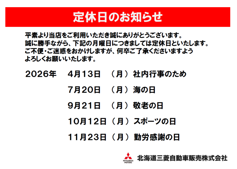 誠に勝手ながら、2026年4月1日より北海道三菱自動車販売株式会社各店舗・部門の定休日を下記の通り変更いたします。